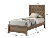 Rooted in rustic charm with a modern twist, this bedroom group showcases a bold chevron-patterned headboard that adds texture and visual interest. The warm wood finish brings an inviting, natural tone to the room, while clean lines and robust framing provide a grounded, contemporary look. Brushed metal drawer pulls add a touch of sleek contrast across the nightstand, dresser, and chest, enhancing the overall aesthetic with functional elegance. With a balance of rugged character and refined simplicity, this ensemble creates a stylish and restful space suited for both casual and curated interiors.