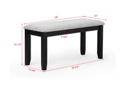 Simple yet stylish, this dining group offers a clean, modern look with everyday functionality. The rectangular table features a weathered gray finish that highlights the wood grain, paired with a contrasting dark frame for a contemporary two-tone effect. Coordinating chairs and a bench showcase wide slat backs and padded seats upholstered in a textured neutral fabric, delivering comfort with a streamlined design. Perfect for casual family meals or relaxed gatherings, this set brings a fresh and versatile presence to any dining space.