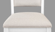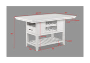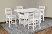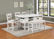 Bring a fresh look to your dining space with this breezy counter height group. The table has an array of design features, including drawers, bottle storage, and an open bottom shelf. Ladderback chairs and bench are upholstered in a Chevron pattern fabric with piping detail.