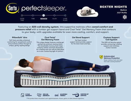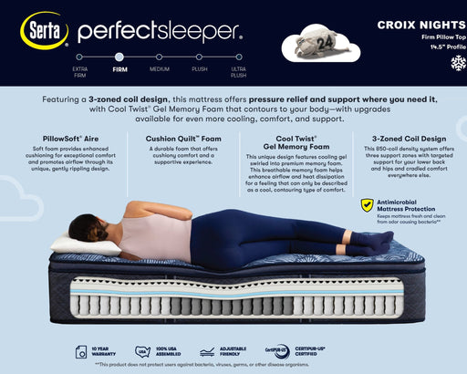 Profile: 14.5 Inch / Plush Pillow-TopSpecifications: Antimicrobial Mattress Protection CoolFeel™ Fabric Fiber Layer PillowSoft ® Aire Serta® Suppo...
