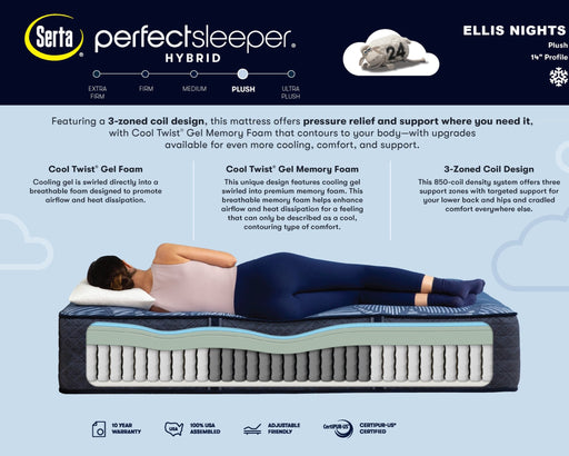 Profile: 14 Inch / PlushSpecifications: CoolFeel™ Fabric Fiber Layer Cool Twist® Gel Memory Foam Cool Twist® Gel Foam 850 3-Zoned Coil System Sert...