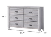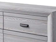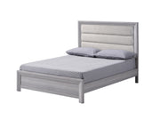 This bedroom set is the embodiment of understated sophistication, featuring a neutral drift wood finish that complements its clean and contemporary design. The robust bed frame anchors the room with a plush channel tufted headboard. Accompanying the bed are coordinating pieces: a dresser with a large mirror, a tall chest for additional storage, and a nightstand to keep essentials within reach. Each piece is crafted with sleek, straight lines and fitted with rectangular cup pulls, creating a cohesive look that’s both modern and timeless.