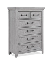 This bedroom suite offers a refreshing take on rustic charm, featuring a soft greige finish that highlights the natural wood grain. The sturdy bed stands as the centerpiece with its robust headboard and inviting design, while the accompanying pieces — a nightstand, dresser, and chest — provide ample storage, each fitted with understated hardware that accentuates the collection's country-inspired look.