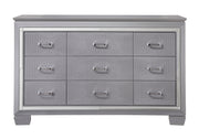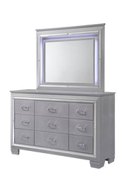 This bedroom collection offers a touch of glamour and luxury to any home. The chic silver finish paired with elegant textured panels creates a sophisticated look that can elevate any bedroom decor. The bed is a statement piece, featuring a stunning tufted headboard with integrated LED lighting that adds a classic touch to the modern design. Accompanying the bed is a selection of matching furniture pieces, including a dresser with a mirror, a tall chest, and nightstands, all finished in the same lustrous silver tone.