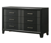 This elegant bedroom collection presents a sophisticated ensemble perfect for creating a refined modern aesthetic in your sleeping quarters. The suite features a sleek, minimalist design with crisp, clean lines and a rich charcoal finish that exudes contemporary charm. Anchoring the set is a robust panel bed with a prominent headboard, promising a sturdy and stylish centerpiece. Flanking the bed are complementary case pieces, offering ample storage with their smooth-gliding drawers accented with chic silver-toned hardware.