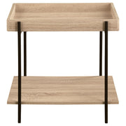 Elevate your living space with this modern coffee table set, combining clean design and versatile function. Crafted from engineered wood and heavy-gauge metal, the set features a light brown wood grain finish that enhances its natural appeal. Each table includes a tray-style tabletop for added depth and security. The slim black metal frames lend a minimalist edge while ensuring durability. Complete with lower shelves, this set provides ample storage or display space for books, decor, or daily essentials.
