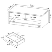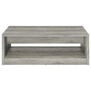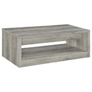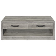 Create a cohesive look in your living space with this rustic coffee table set. Featuring a weathered gray wood-look finish, the set is crafted with engineered wood and scratch-resistant veneer for durability. Each piece includes clean lines, spacious storage drawers with bold black metal handles, and open shelves for additional display or storage. This set blends rustic charm and functionality, making it ideal for casual and modern interiors alike.