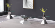 Elevate your living space with this contemporary coffee table set, featuring tempered glass tops and polished stainless steel hourglass-inspired bases. The coffee table boasts a rectangular top, while the end table offers a square top, both with beveled edges for added refinement. Clear glass surfaces highlight the sculptural curves and geometric design of the bases. Designed for modern interiors, this set combines sleek artistry with practical functionality.