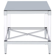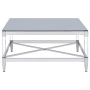 Transform your living room with this coffee table set, a stunning combination of mirrored tempered glass tops and chrome-electroplated frames. The coffee table and end table feature square tops that reflect light and color, creating vibrant focal points. Clear acrylic leg posts add an airy, floating aesthetic, while tapered feet provide stability and elegance. Designed for modern interiors, this set combines contemporary artistry with practical functionality.
