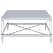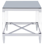 Transform your living room with this coffee table set, a stunning combination of mirrored tempered glass tops and chrome-electroplated frames. The coffee table and end table feature square tops that reflect light and color, creating vibrant focal points. Clear acrylic leg posts add an airy, floating aesthetic, while tapered feet provide stability and elegance. Designed for modern interiors, this set combines contemporary artistry with practical functionality.