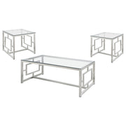 This coffee table set enhances your living room with a cohesive, modern design. Featuring a tempered glass top and electroplated chrome frames, each piece combines durability with a sleek, polished finish. The open geometric bases add a touch of contemporary flair while providing structural stability. Perfect as an occasional living room set, this collection offers versatile functionality for both decorative display and practical use, blending style and substance effortlessly.