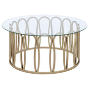 This coffee table set features a round design with clear tempered glass tops supported by sturdy metal frames. The frames are finished in electroplated chocolate chrome, delivering a sophisticated, deeper brass tone. The geometric base design on both tables adds a contemporary touch, while the tempered glass tops provide durability and easy maintenance. These tables offer functional elegance, making them an excellent addition to any living room or lounge area.