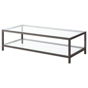 This modern coffee table set features a black nickel electroplated steel frame paired with clear tempered glass surfaces. Designed for versatility and style, the set offers spacious tabletops and lower shelves for display and storage. The minimalist open-frame design emphasizes clean lines and a contemporary aesthetic, making it a perfect addition to various living room styles. Durable tempered glass ensures lasting use while maintaining a sleek, elegant appearance.