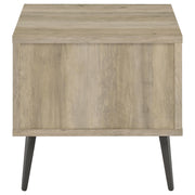 This coffee table set combines retro-inspired elements with modern practicality for a timeless living room update. The coffee table features a sleek rectangular silhouette, complete with a deep gray drawer front and open compartment for storing periodicals and books. The end table, with its square shape, offers a deep gray interior shelf to organize both tall and small items. Both tables are constructed from distressed pine finish engineered wood and rubberwood, with tapered rounded legs for a nod to retro style.