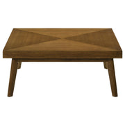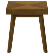 This coffee table set captures the essence of mid-century modern design, combining timeless elegance with bold craftsmanship. The coffee table features a striking walnut brown veneer parquet top, showcasing a geometric wood grain pattern that draws attention. Paired with the end table, which mirrors this aesthetic with its square silhouette and textured top, this set elevates any space with a sophisticated and functional touch. Both pieces share a robust yet refined design that anchors the room in style, making them a perfect combination of form and history.