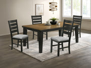 This dining group effortlessly combines farmhouse warmth with modern sophistication, creating a captivating focal point for any dining space. The table features a rich, two-tone design with a beautifully finished wood top and contrasting dark legs, delivering a striking visual appeal that suits various decor styles. The ladder-back chairs and tufted bench offer both style and comfort, with plush upholstery in a versatile neutral tone that invites guests to linger. With its blend of rustic charm and contemporary flair, this set is perfect for both intimate family meals and lively gatherings, making your dining area a stylish and welcoming retreat.