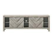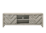 Discover the epitome of rustic elegance with this captivating entertainment console, designed to anchor your living space with its distinct and artful presence. The washed wood finish offers a serene, natural aesthetic that brings the essence of a tranquil retreat into your home. The geometric chevron patterning on the cabinet doors adds a touch of modern sophistication, making it a versatile piece that complements both contemporary and traditional interiors. Function meets form as this console provides ample space for multimedia devices, gaming consoles, and other essentials, all while maintaining a clutter-free environment.