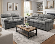 Sink into the luxurious comfort of this charcoal sofa and loveseat. Wrapped in a velvety polyester plush pile fabric, every detail is designed for your well-being. Enjoy super comfortable seating with features like deeply padded arms, specialized lumbar support, and a plush padded headrest.