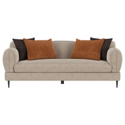 Experience a sophisticated blend of architectural design and plush comfort with this sofa. The latte chenille upholstery provides a subtle textured appeal, complemented by sculpted round arms and a matching back that mirror each other’s clean lines. Its waterfall bench seat offers a seamless look, supported by a sinuous spring seat deck and full foam cushioning for superior comfort. Reversible rust and chocolate accent pillows add warmth, while sleek, tapered metal legs complete its contemporary charm.