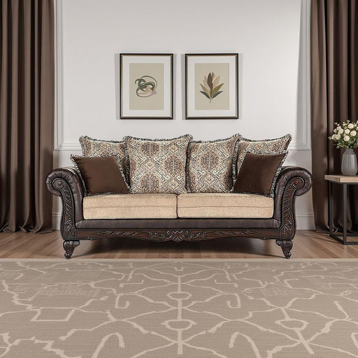 Instill modern appeal with a charming upholstered sofa in soft chenille. Its neutral latte coloration is complemented with tone-on-tone accent pill...