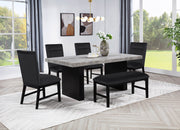 Transform your dining area with this contemporary and stylish collection that exudes modern elegance. The striking centerpiece features a stunning faux concrete top, complemented by a robust dark base, creating a perfect blend of luxury and durability. Accompanied by sleek upholstered chairs and a versatile bench, this set offers comfortable and sophisticated seating options for family and guests. Designed with both aesthetics and functionality in mind, this ensemble elevates your space, making it ideal for both everyday dining and special gatherings. Experience a seamless fusion of comfort and style with this exquisite addition to your home.